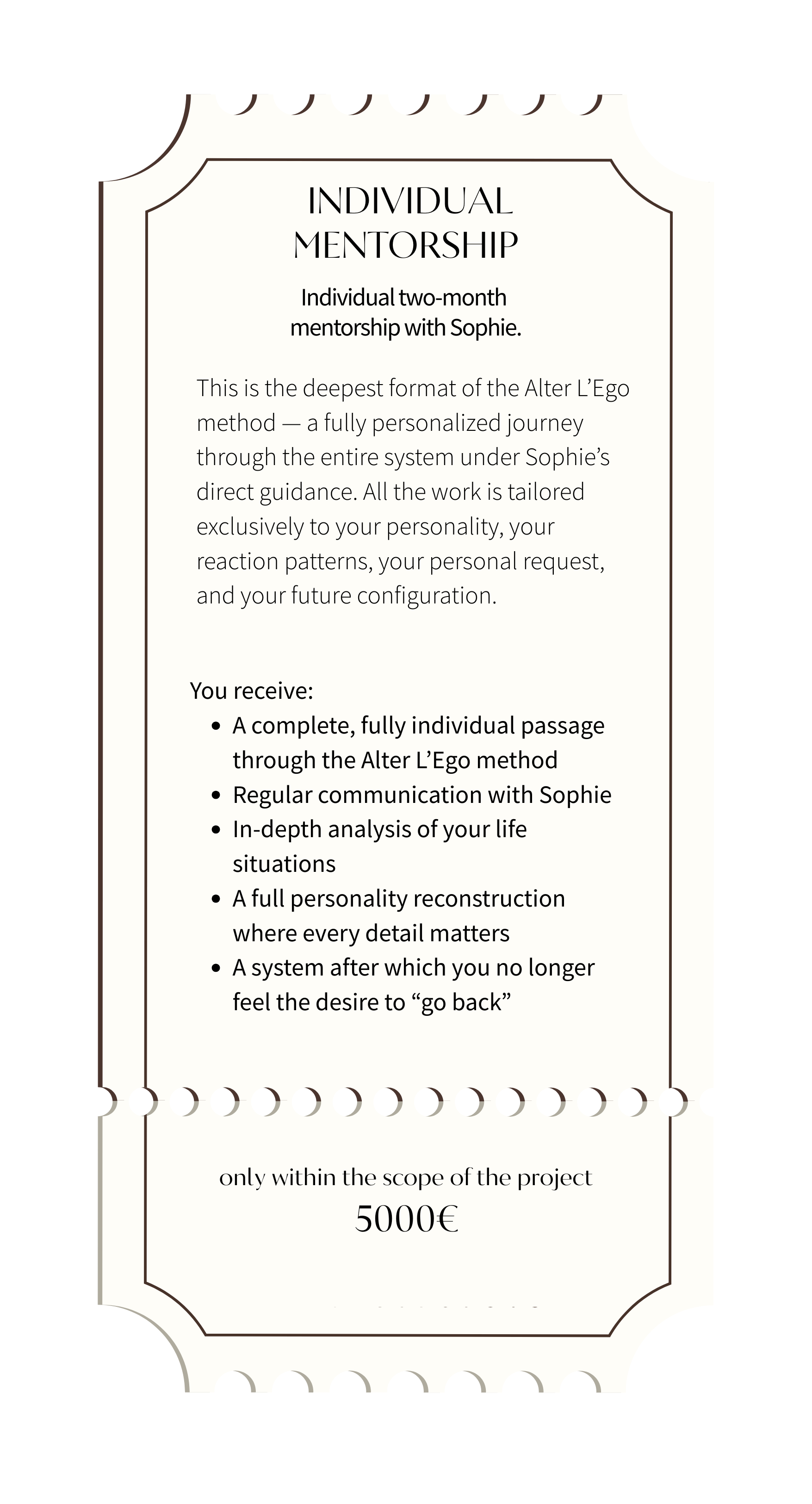 After receiving her education in psychological film screenwriting in Los Angeles, Sophie developed her own method of working with clients, drawing on the Alter Ego approach and the craft of professional screenwriters. In her hands, a person doesn’t simply grow — they become a living piece of literature, gaining a deeply personalized tool for self-knowledge and transformation. Through specially crafted characters that reflect a client’s hidden qualities and unconscious roles, Sophie helps people see their true potential and awaken their inner resources. Bogarne also hosts exclusive events and retreats and writes books. Her clients include well-known international artists, members of royal families, and influential business figures.